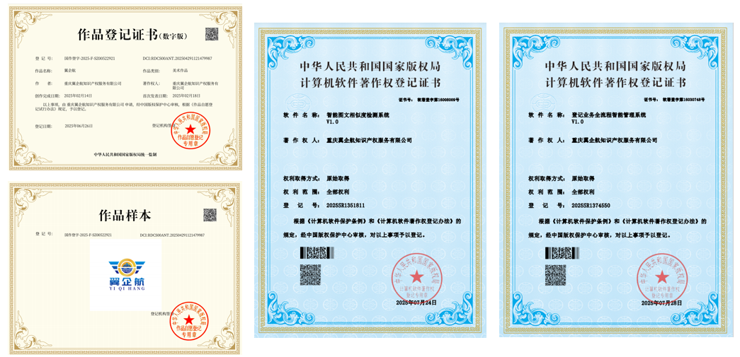 多元周边服务加持,全维度赋能企业发展 除了核心的商标服务,翼企航知识产权还围绕企业发展全周期,提供全方位的企业办证合规服务,累计为全国200余家企业办理各类资质认证,办证成功率高达98%,同样推出“不下证全额退款”保障服务。其中,特许经营备案作为核心板块,已为全国100多家连锁企业办理必备的加盟许可备案,与全国多地区商务审核部门深度对接,流程熟练、资料处理快捷高效,有效降低企业经营风险;同时还提供条形码代办、邓白氏编码申请、ICP/EDI增值电信许可办理、森林认证、三体系认证、非遗项目申请等服务,做到事先全面辅导、事中合规处理、事后及时领证,全方位提升企业市场竞争实力。 在版权保护领域,翼企航知识产权提供软著申请、著作权登记服务,为企业源代码、美术设计LOGO、原创作品等提供合法保护,不仅守护企业原创成果,还能为企业申请政策补贴、提升品牌价值提供支撑,实现知识产权的全方位保护。
